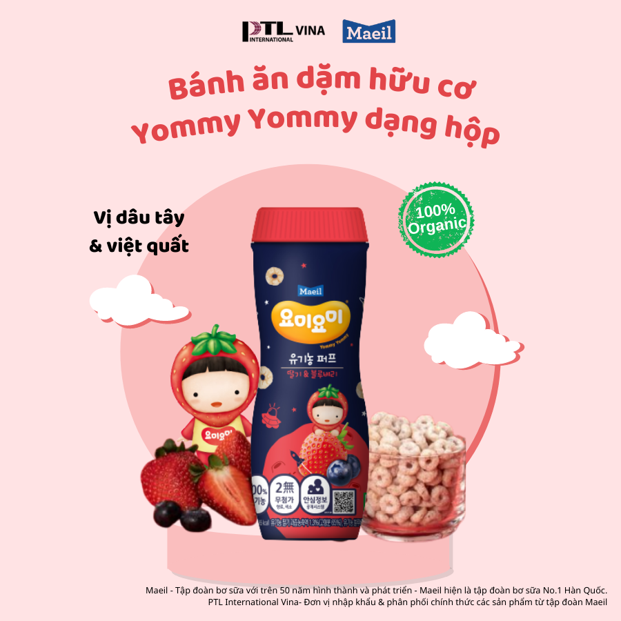 - Bánh ăn dặm hữu cơ Yommy Yommy Maeil dạng hộp có 3 hương vị cho bé khám phá: