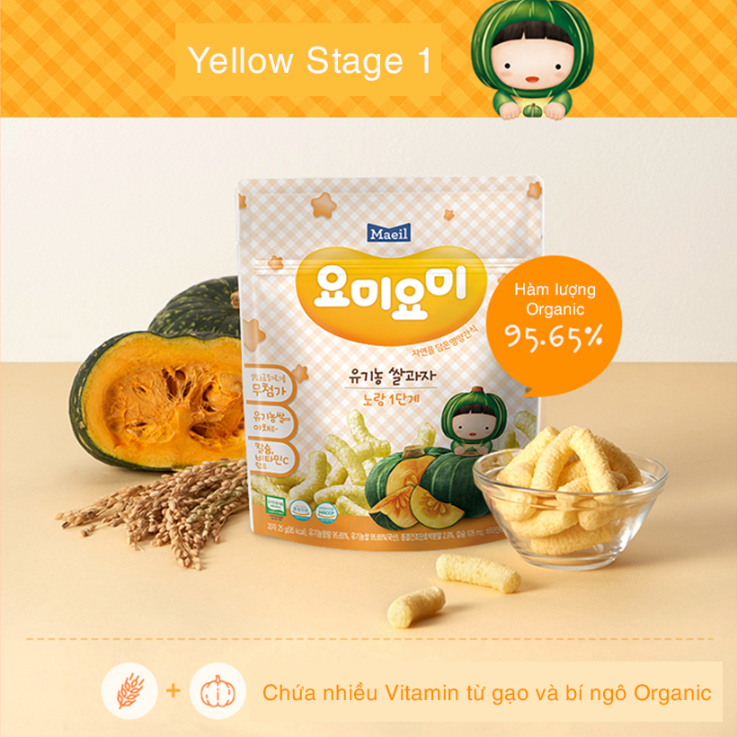 - Bánh gạo Organic - hữu cơ Yummy Yummy Yellow Stage 1 vị bí ngô chứa nhiều vitamin và chất từ gạo và bí ngô