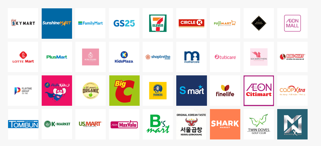 Bibo Mart, Aeon Mall, Tuticare, Soc & Brothers, KidsPlaza, Vinmart, Lotte Mart, Circle K...