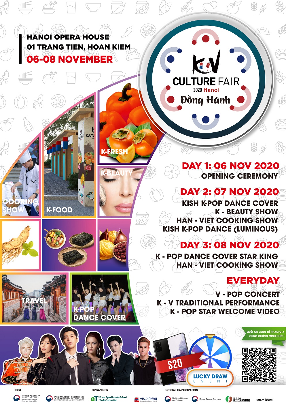 KV Culture Fair 2020 (Hội chợ giao lưu văn hóa Việt Hàn) được tổ chức tại Nhà hát lớn Hà Nội – một biểu tượng văn hóa nổi tiếng của thủ đô ✨Tại đây, các bạn sẽ được tự do trải nghiệm hơn 50 gian hàng quảng bá văn hóa & ẩm thực Việt Hàn, những màn biểu diễn Cooking-show của đầu bếp nổi tiếng hai nước, những tiết mục biểu diễn văn nghệ truyền thống và đặc biệt là liveshow ca nhạc của nhiều ca sỹ đình đám V-POP hiện nay như: Bích Phương, Đức Phúc, Noo Phước Thịnh, Erik, Min....