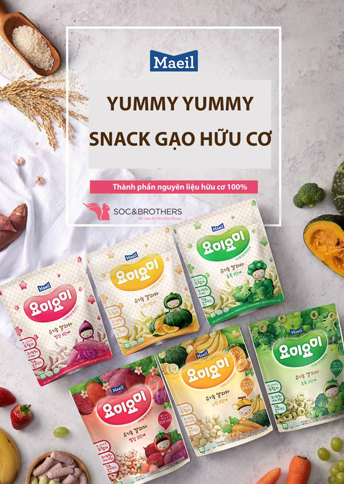 - Snack gạo hữu cơ Yummy Yummy với các nguyên liệu 100% từ hữu cơ, an toàn và cung cấp các chất dinh dưỡng thiết yếu cho sự phát triển khỏe mạnh của bé.